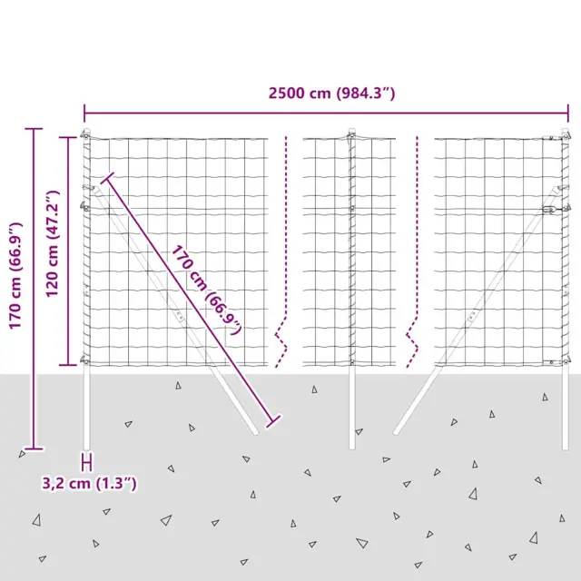 • Splošne dimenzije: 2500 x 3.2 x 120 cm (D x Š x V)