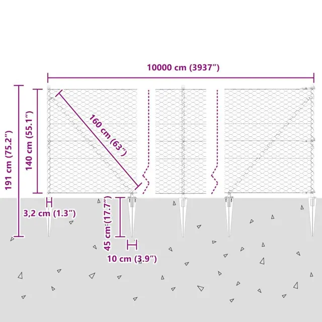 • Splošne dimenzije: 10000 x 3.2 x 140 cm (D x Š x V)
