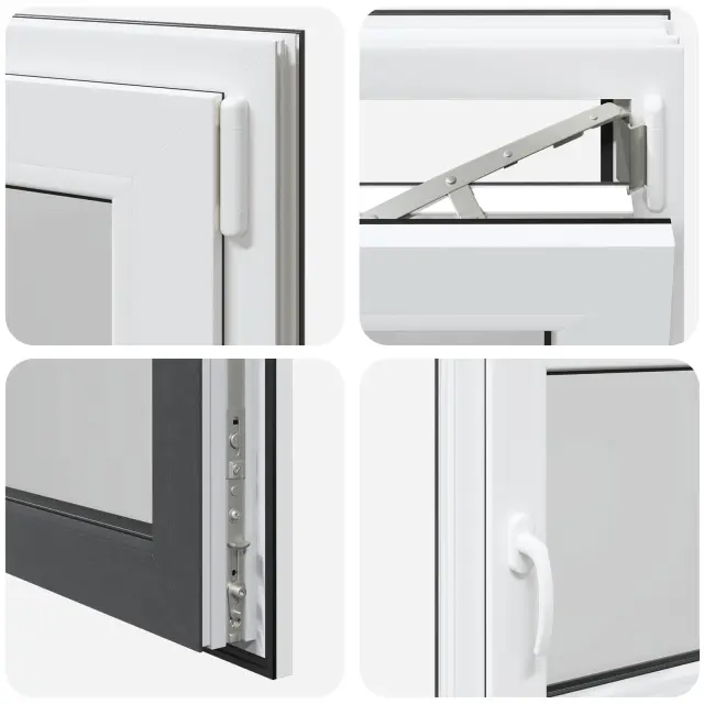 • Visokokakovostni materiali: Okno je izdelano iz PVC in stekla, kar mu daje moderen in čist videz ter dolgo življenjsko dobo. Močan PVC okvir zagotavlja eleganten zaključek, medtem ko steklo omogoča vstop naravne svetlobe, kar osvetli vaš dom in ustvari svež občutek.