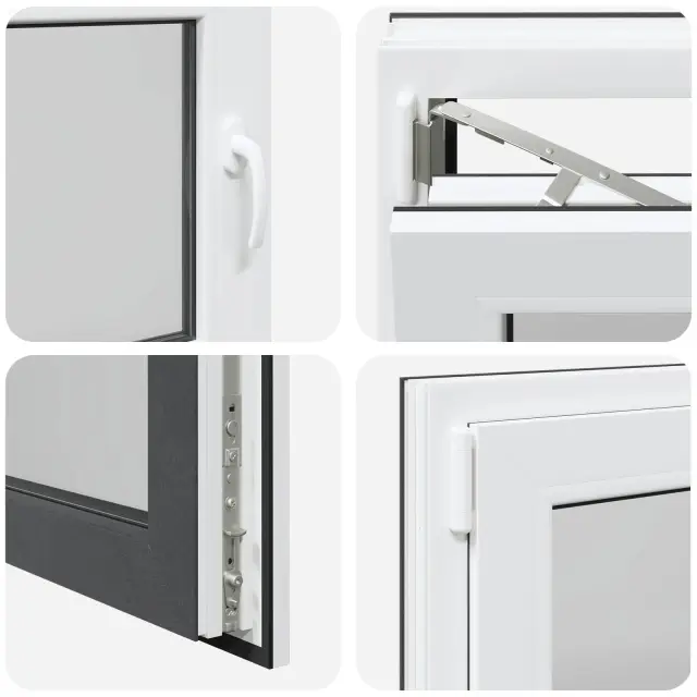 • Visokokakovostni materiali: Okno je izdelano iz PVC in stekla, kar mu daje moderen in čist videz ter dolgo življenjsko dobo. Močan PVC okvir zagotavlja eleganten zaključek, medtem ko steklo omogoča vstop naravne svetlobe, kar osvetli vaš dom in ustvari svež občutek.