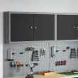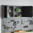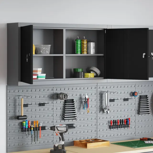 Ta moderna stenska omara je idealna rešitev za shranjevanje obrti in stvari. Povečuje funkcionalnost in videz vašim notranjim prostorskim. S svojim svetlim sivim zaključkom in izstopajočimi črnimi detajli je omara estetika in praktčnost, popolna za prostore, kot so balkoni, ustvarjalne sobe ali delavnice.