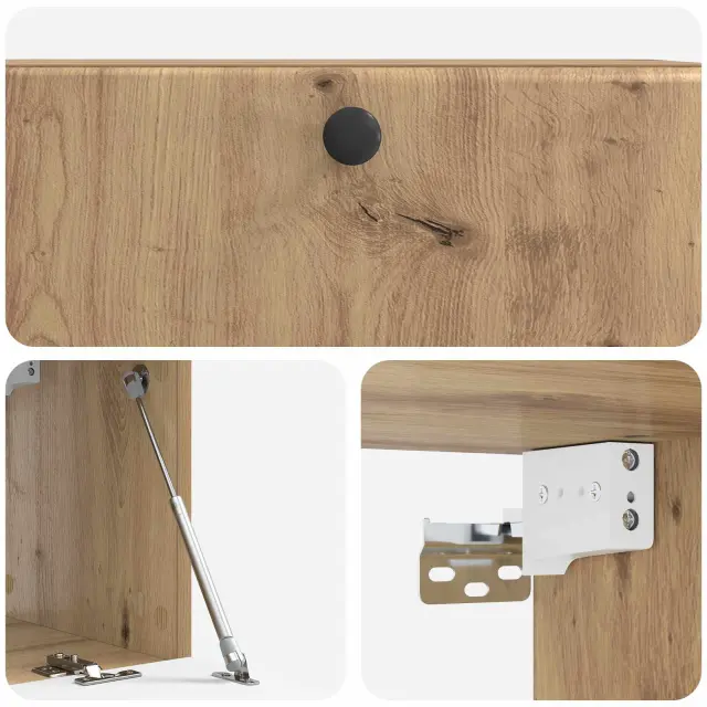 • Vključene komponente: Regal ima 90° vrata s tečaji in kovinske gumbe, kar omogoča hiter dostop do stvari. Vsaka komponenta je zasnovana tako, da je uporaba pametna in prostor ostane urejen. Z visečo zasnovo pa izkoristite talni prostor in se brez problema vklopi v dnevne prostore.
