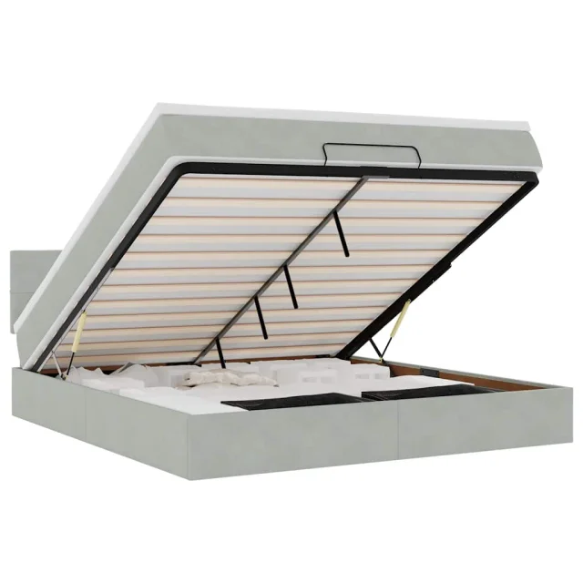• Veliko prostora za shranjevanje pod posteljo: Zahvaljujoč hidravličnemu dvižnemu mehanizmu je pod posteljnim okvirjem na voljo veliko prostora za shranjevanje pod posteljo, kar povečuje prostor, ne da bi zavzemal dodatno talno površino. S preprostim potegom ročaja se podnožje z letvami gladko dvigne, tako da lahko hitro in brez napora poberete svoje predmete.