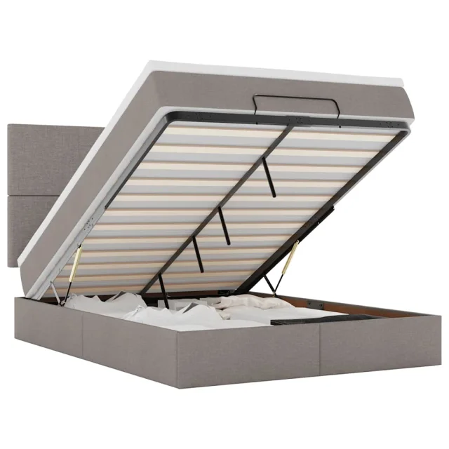 • Veliko prostora za shranjevanje pod posteljo: Zahvaljujoč hidravličnemu dvižnemu mehanizmu je pod posteljnim okvirjem na voljo veliko prostora za shranjevanje pod posteljo, kar povečuje prostor, ne da bi zavzemal dodatno talno površino. S preprostim potegom ročaja se podnožje z letvami gladko dvigne, tako da lahko hitro in brez napora poberete svoje predmete.