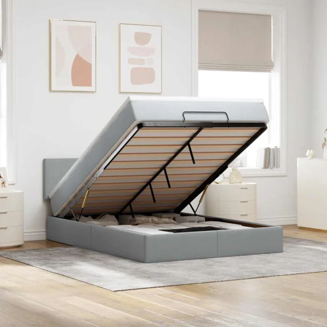 • Veliko prostora za shranjevanje pod posteljo: Zahvaljujoč hidravličnemu dvižnemu mehanizmu je pod posteljnim okvirjem na voljo veliko prostora za shranjevanje pod posteljo, kar povečuje prostor, ne da bi zavzemal dodatno talno površino. S preprostim potegom ročaja se podnožje z letvami gladko dvigne, tako da lahko hitro in brez napora poberete svoje predmete.