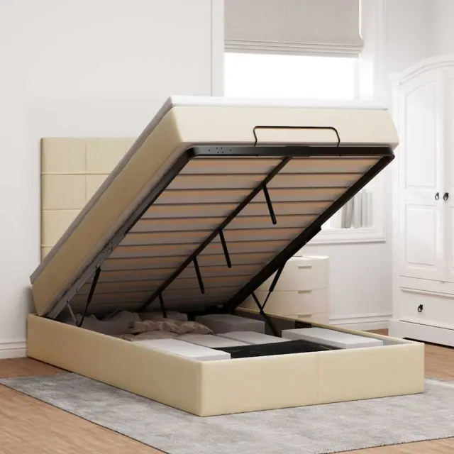 S tem okvirjem za posteljo otoman z ležiščem lahko uživate v mirnem spancu! Ponuja vam rešitev za shranjevanje in udobno spanje.