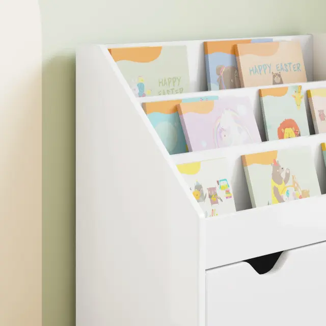 • Prijazne značilnosti za otroke: Regal je zasnovan za mlade uporabnike z dostopnimi policami, ki spodbujajo organizacijo in samostojnost. Nežna oblika in stabilna osnova zmanjšujejo tveganja, zagotavljajo pa varen prostor za vašega malčka.