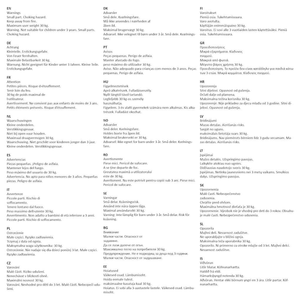 Opozorila Majhni deli. Nevarnost zadušitve. Ne uporabljajte v bližini ognja. Maksimalna teža uporabnika 30 kg. Opozorilo. Ni primerno za otroke mlajše od 3 let. Majhni delci. Nevarnost zadušitve.