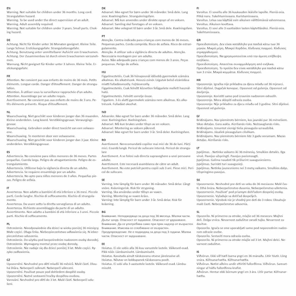 Opozorilo. Ni primerno za otroke, mlajše od 36 mesecev. Majhni deli. Dolga vrvica. Nevarnost zadušitve zaradi tujka. Nevarnost zadavitve. Opozorilo. Igrača se sme uporabljati samo pod neposrednim nadzorom odrasle osebe. Opozorilo. Sestaviti mora odrasla oseba. Opozorilo. Ni primerno za otroke mlajše od 3 let. Majhni delci. Nevarnost zadušitve.