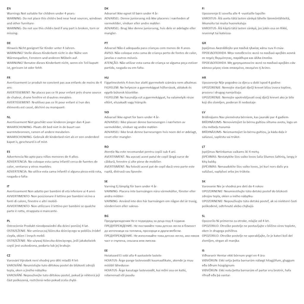 Opozorilo Ni primerno za otroke, mlajše od 4 let. OPOZORILO. Otroške postelje ne postavljajte v bližino virov toplote, oken in drugega pohištva. OPOZORILO. Otroške postelje ne uporabljajte, če je kateri koli del zlomljen, strgan ali manjka.