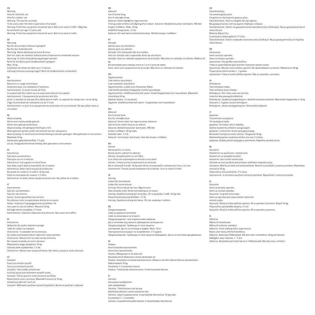 Opozorilo Samo za domačo uporabo. Samo za zunanjo uporabo. Opozorilo. Ta igrača nima zavor. Samo za uporabo pod neposrednim nadzorom odrasle osebe. Opozorilo. Nositi je treba zaščitno opremo. Ni za uporabo v prometu. Največ 50 kg. Priporočena uporabniška skupina, 2-5 let. Opozorilo. Nositi je treba zaščitno opremo. Ni za uporabo v prometu.