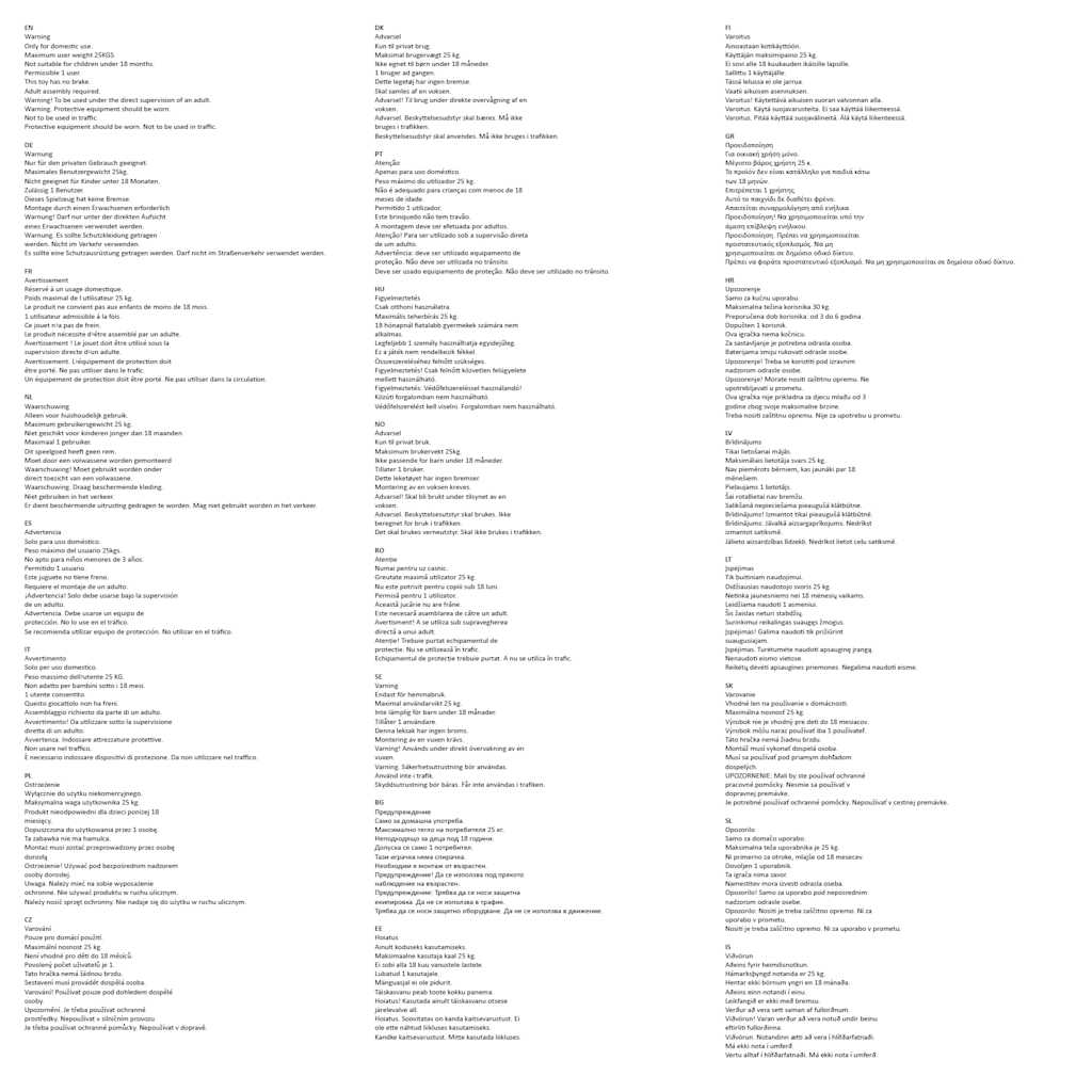 Opozorilo Samo za domačo uporabo. Maksimalna teža uporabnika je 25 kg. Ni primerno za otroke, mlajše od 18 mesecev. Dovoljen 1 uporabnik. Ta igrača nima zavor. Namestitev mora izvesti odrasla oseba. Opozorilo! Samo za uporabo pod neposrednim nadzorom odrasle osebe. Opozorilo: Nositi je treba zaščitno opremo. Ni za uporabo v prometu. Nositi je treba zaščitno opremo. Ni za uporabo v prometu.