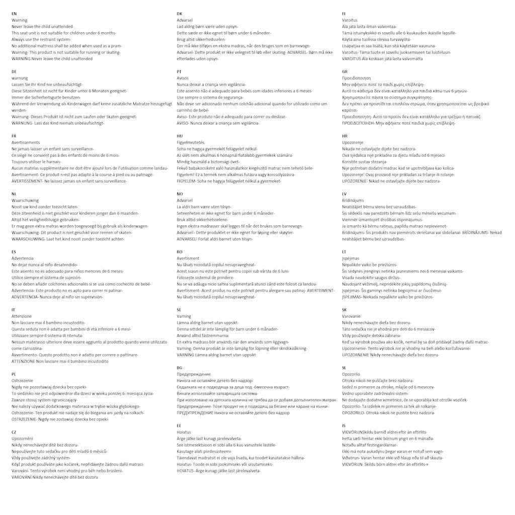 OPOZORILO Otroka nikoli ne puščajte brez nadzora. Sedež ni primeren za otroke, mlajše od 6 mesecev. Vedno uporabite zadrževalni sistem. Ne dodajajte dodatne vzmetnice, če se uporablja kot otroški voziček. Opozorilo. Ta izdelek ni primeren za tek ali rolkanje. OPOZORILO. Otroka nikoli ne pustite brez nadzora.