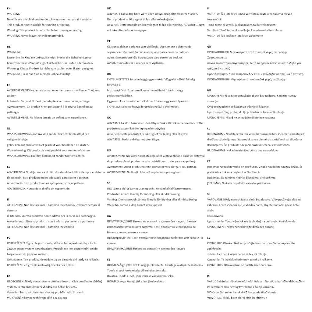 OPOZORILO Otroka nikoli ne puščajte brez nadzora. Vedno uporabite zadrževalni sistem. Ta izdelek ni primeren za tek ali rolanje. Opozorilo. Ta izdelek ni primeren za tek ali rolkanje. OPOZORILO. Otroka nikoli ne pustite brez nadzora.