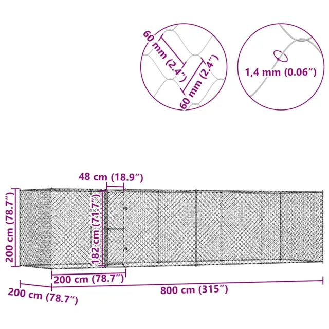 vidaXL Pasja kletka srebrna 800 x 200 x 256 cm Cinkana jeklena