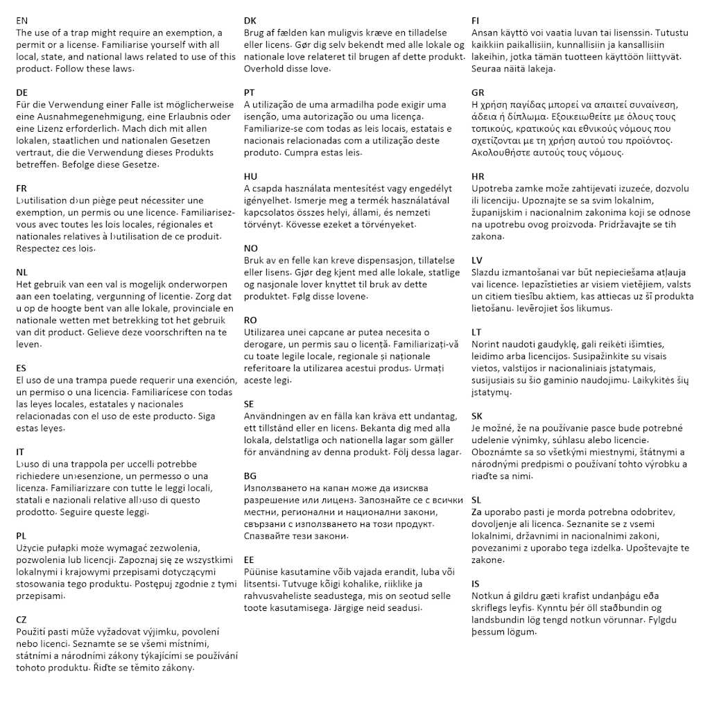 Za uporabo pasti je morda potrebna odobritev, dovoljenje ali licenca. Seznanite se z vsemi lokalnimi, državnimi in nacionalnimi zakoni, povezanimi z uporabo tega izdelka. Upoštevajte te zakone.