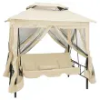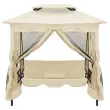 Ta stilski in prostoren paviljon z gugalnico se ponaša s prostorno in stilsko obliko, udobnim sedežem za dve osebi in veliko streho, ki zagotavlja zaščito pred soncem. Zahvaljujoč zavesam s kavlji in zankami boste lahko vse štiri stranice zaprli in tako ustvarili zaprt prostor. Zaprta mreža bo izven paviljona zadržala leteče insekte, vam pa bo zagotovila zaseben prostor. Sedež se lahko pretvori v posteljo. Za dodatno udobje so priloženi tudi vzglavniki in sicer dva pravokotna in dva valjasta vzglavnika. Vzdržljiv jeklen okvir je zaščiten z oblogo iz umetne mase, ki je odporna na korozijo. Vodoodporne prevleke za blazine so izdelane iz poliestra, poleg tega pa so snemljive, za lažje čiščenje. Tudi sestava je zelo preprosta.Barva: Kremno belaMaterial: Blago in jeklen okvir s prašnim premazomDimenzije: 220 x 160 x 240 cm (D x Š x V)Velikost sedeža: 156 x 52 cm (D x Š)Velikost postelje (ko se sedež pretvori v posteljo): 156 x 104 cm (D x Š)Višina sedeža, merjena od tal: 48 cmDebelina blazine za sedež: 6 cmMaks. nosilnost (na sedež): 110 kgPriloženi 4 vzglavniki (2 pravokotna in 2 valjasta)Montaža je zelo preprostaTkanina: Poliester: 100% 43239