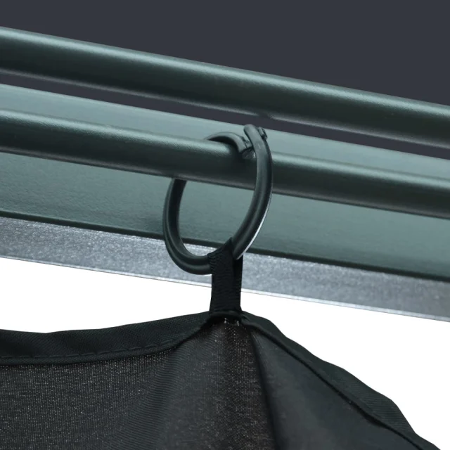 Streha iz oksford blaga s PA oblogo ščiti pred bleščanjem in škodljivimi UV žarki neposredne sončne svetlobe. Ta paviljon je trdno izdelan iz močnega aluminija in jekla, zato je odporen na rjavenje in zelo stabilen. Paviljon ima 4 stranice, ki jih lahko namestite v slabem vremenu. Priložene so tudi mreže, ki preprečujejo vstop žuželkam in zagotavljajo dobro kroženje zraka. Za preprosto namestitev so priložene tudi kljukice in zanke za pritrditev. Lučke na vrvici ustvarjajo prijetno vzdušje na vašem vrtu, ko zaide sonce. Lučke ne onesnažujejo okolja, saj se podnevi polnijo na solarno energijo.