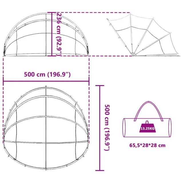 • Celoten komplet: Kupolni šotor vsebuje vse potrebne dodatke, vključno s fleksibilnimi steklenimi palicami, torbo za prenašanje in vrvmi za stabilizacijo. Vse kar potrebujete je vključeno, namestitev je enostavna in zagotavlja varnost v vetrovnih razmerah.