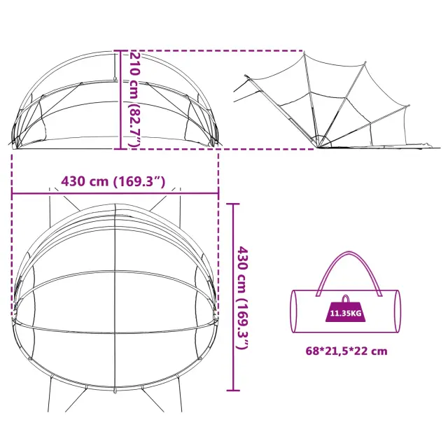 • Celoten komplet: Kupolni šotor vsebuje vse potrebne dodatke, vključno s fleksibilnimi steklenimi palicami, torbo za prenašanje in vrvmi za stabilizacijo. Vse kar potrebujete je vključeno, namestitev je enostavna in zagotavlja varnost v vetrovnih razmerah.