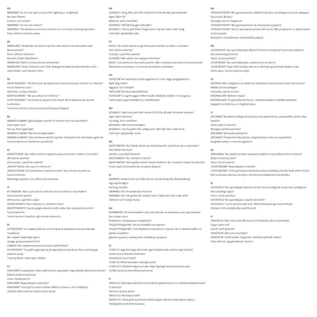 OPOZORILO: Ne uporabljajte alkohola ali bencina za prižiganje ali ponovno prižiganje! Brez odprtega ognja! Pozor, vroča površina! OPOZORILO! Ne uporabljajte v zaprtih prostorih! OPOZORILO! Ta žar postane zelo vroč. Med delovanjem ga ne premikajte. Otroke in hišne ljubljenčke zadržite proč.
