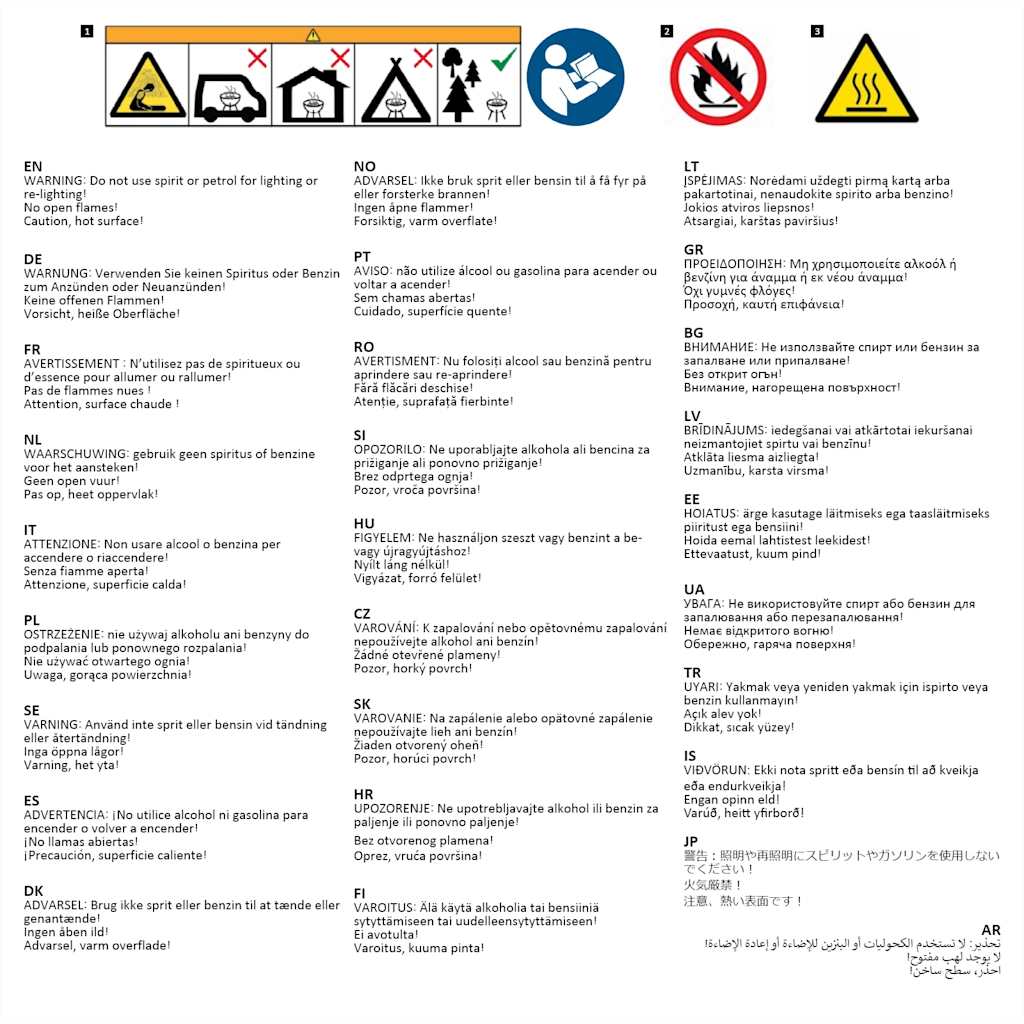 OPOZORILO! Ne uporabljajte v zaprtih prostorih! OPOZORILO! Ta žar postane zelo vroč. Med delovanjem ga ne premikajte. Otroke in hišne ljubljenčke zadržite proč.