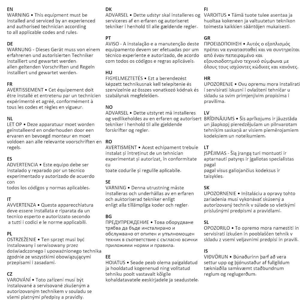 OPOZORILO • To opremo mora namestiti in servisirati izkušen in pooblaščen tehnik v skladu z vsemi veljavnimi predpisi in pravili.