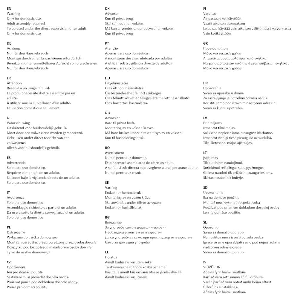 Opozorilo Samo za domačo uporabo. Namestitev mora izvesti odrasla oseba. Igrača se sme uporabljati samo pod neposrednim nadzorom odrasle osebe. Samo za domačo uporabo.