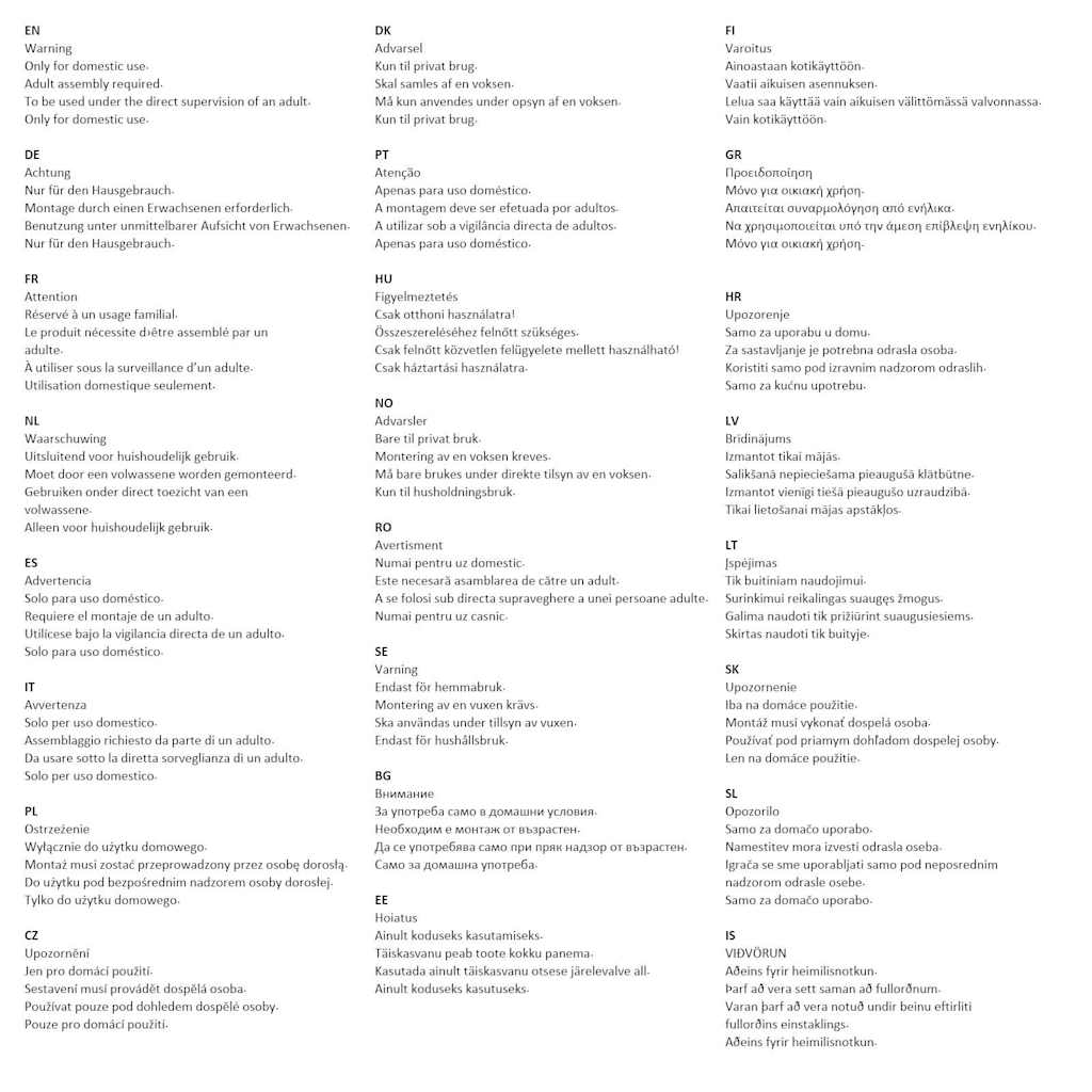 Opozorilo Samo za domačo uporabo. Namestitev mora izvesti odrasla oseba. Igrača se sme uporabljati samo pod neposrednim nadzorom odrasle osebe. Samo za domačo uporabo.