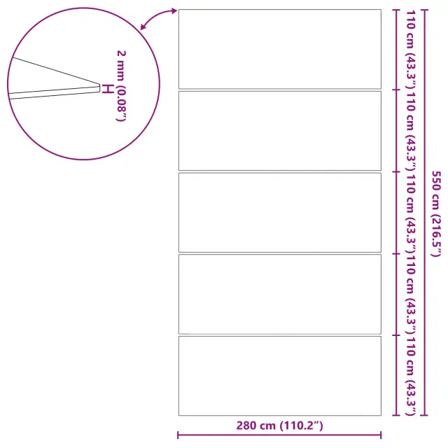 • Splošne dimenzije: 550 x 280 x 0,1 cm (D x Š x V)