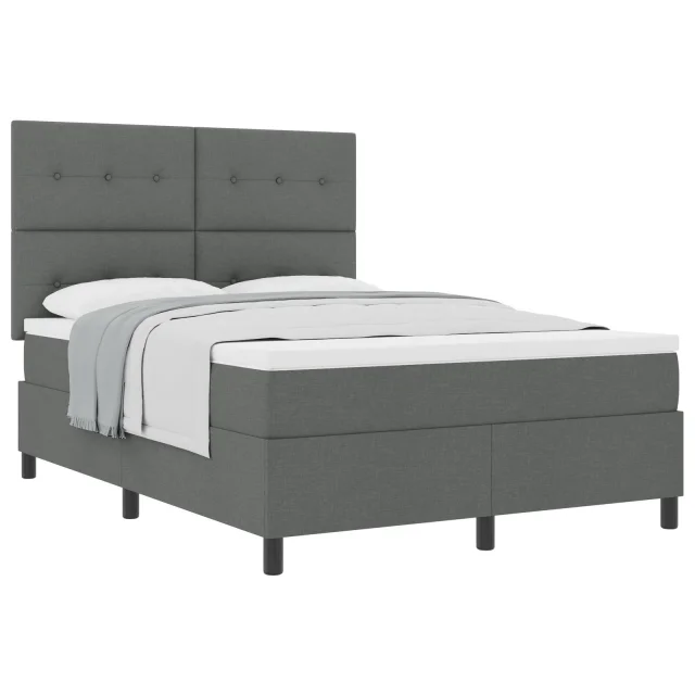 Ta podstavljena postelja združuje eleganco in praktičnost, kar jo naredi odlično izbiro za spanje v spalnici. Temno siva tkanina in trdne lesene noge prinašajo stil in dolgotrajno kvaliteto.
