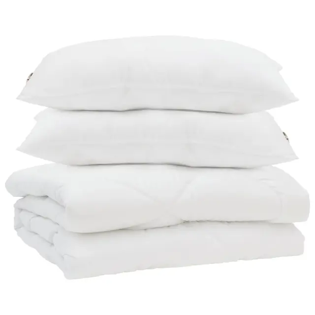 • Vključene komponente Poleg odeje dobite še dve blazini. Vsaka je izdelana iz kombinacije bombaža in poliestra ter napolnjena s poliestrskimi vlakni. Te komponente nudijo celovito podporo za tvojo glavo in vrat, kar prinaša dodatno sprostitev med počitkom.