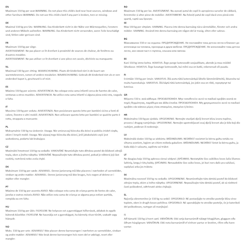 Največja obremenitev je 110 kg na sedež. OPOZORILO. NE postavljajte te otroške postelje blizu virov toplote, oken in drugih kosov pohištva. OPOZORILO. NE uporabljajte te otroške postelje, če je katerikoli del poškodovan, raztrgan ali manjkajoč.