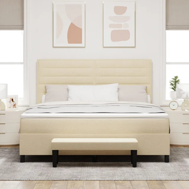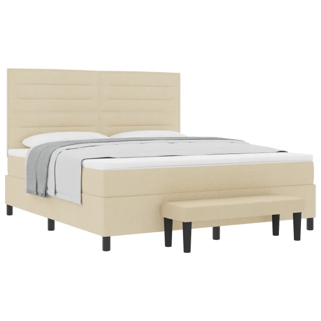 Ta postelja na vzmet združuje stil in praktičnost, kar jo naredi odlično izbiro za vsako spalnico ali bivalni prostor. Chic kremast zaključek in trdne lesene noge ustvarjajo prijetno moderno vzdušje - idealno za udobne noči in popestritev tvoje dekoracije.