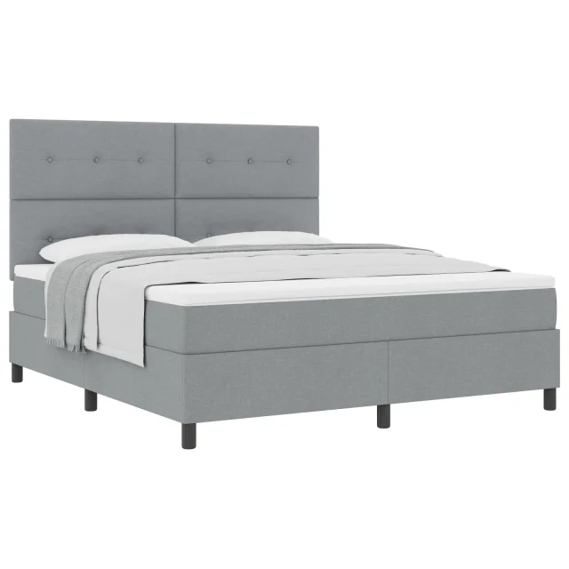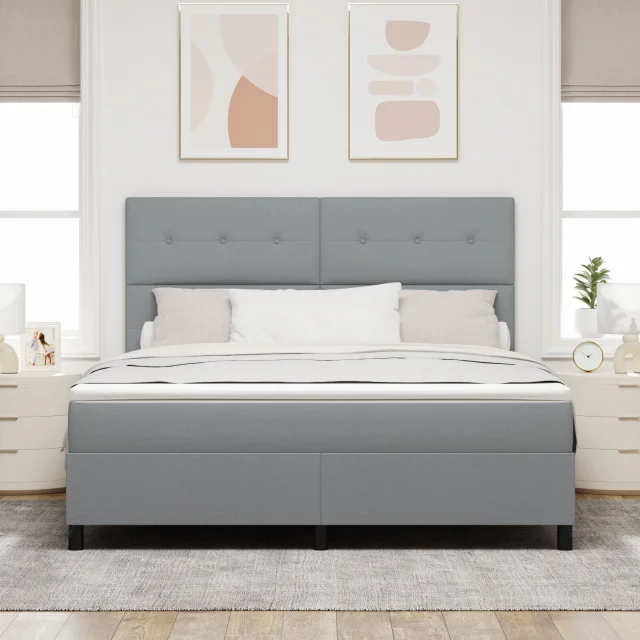 Ta postelja s pomičnim vzmetenjem združuje eleganco in praktičnost ter ponuja odlično rešitev za spanje v vaši glavni spalnici. Svetlo siva tkanina in močne borove noge dodajajo slog ter zagotavljajo trajnost in udobje.
