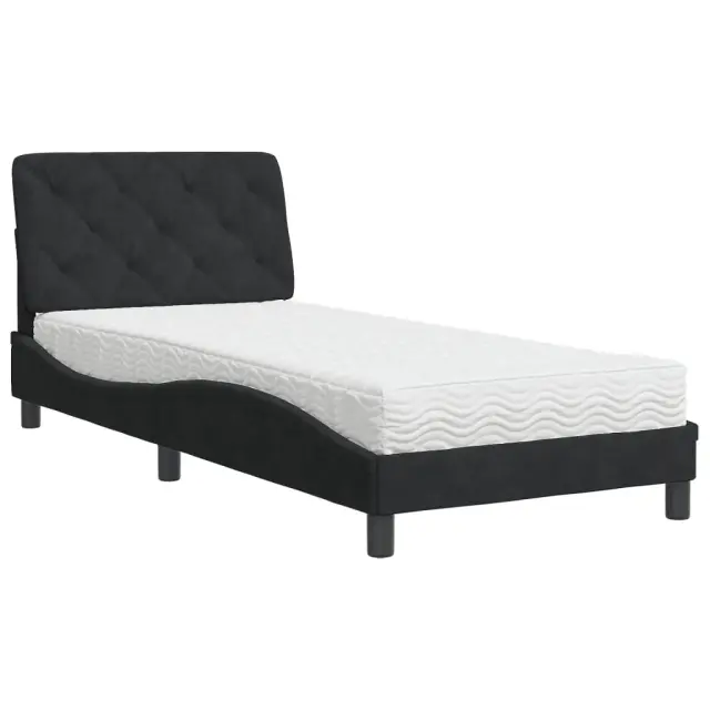 S to posteljo z vzmetnico si zagotovite bolj miren spanec! Je prijeten dodatek za vsako spalnico. Mehak žamet: Žamet je mehka in udobna tkanina, ki je prijetna do kože.Letvice iz vezanega lesa: Letvice iz vezanega lesa omogočajo dobro porazdelitev teže in zagotavljajo, da vzmetnica ostane na mestu ob vsakem zasuku in obračanju med spanjem.Udobna opora: To vzglavje za posteljo vam zagotavlja odlično oporo za hrbet, ko sedite na postelji in berete ali gledate filme.Vzmetnica iz pene: Za optimalno udobje je ta triplastna vzmetnica iz tkanine napolnjena z 22D PU peno. Pomaga lajšati utrujenost in spodbuja krvni obtok ter zagotavlja popolno sprostitev in kakovosten spanec. Poleg tega je vzmetnica na voljo v trdotah H2 in H3, tako da jo lahko preprosto obrnete in izberete trdoto, ki vam najbolj ustreza.Valovita stranica: Valoviti videz posteljnega okvirja je eleganten in prefinjen. Dekorju v vašem domu dodaja sodoben in eleganten pridih ter tako postane osrednja točka spalnice.Posteljni okvir:Barva: ČrnaMaterial: Žamet (100 % poliester), kovina, trdna borovina, vezan les, inženirski lesCelotne dimenzije: 218 x 85 x 74,5 cm (D x Š x V)Oblazinjeno vzglavje:Barva: ČrnaMaterial: Žamet (100 % poliester)Material polnila: PenaDimenzije: 82 x 6 x 48 cm (D x Š x V)Vzmetnica iz pene:Barva: Bela Material prevleke: Pletenina Material polnila: 22D PU pena Trdota: H2 in H3 Celotne dimenzije: 80 x 200 x 17 cm (Š x D x D)Potrebno sestavljanje: DaPaket vsebuje:1 x Posteljni okvir1 x Oblazinjeno vzglavje1 x Vzmetnica iz pene 3208624
