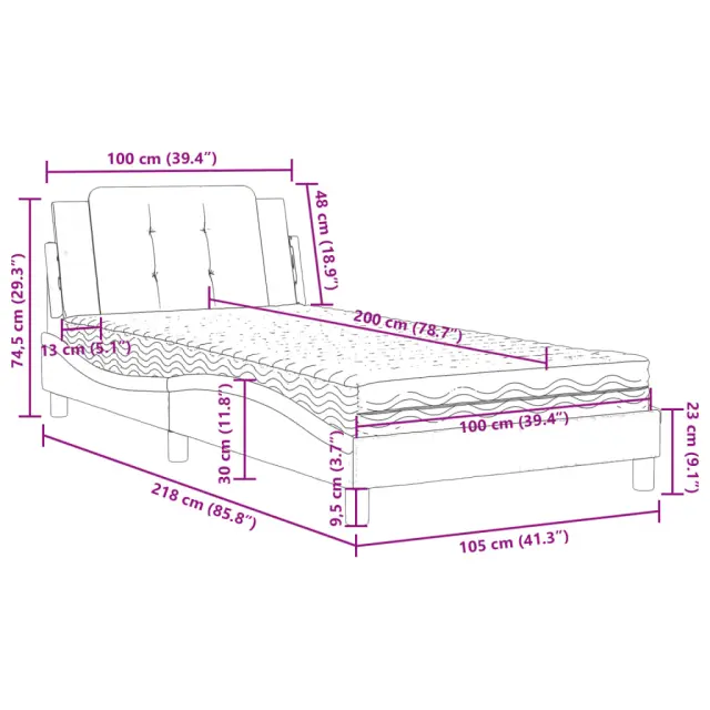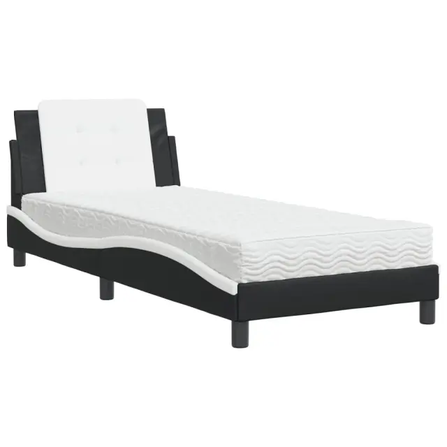 S to posteljo z vzmetnico si zagotovite bolj miren spanec! Je prijeten dodatek za vsako spalnico. Trpežno umetno usnje: Vrhunsko umetno usnje je zelo vzdržljiv material. Je odporno na madeže, zato ga lahko preprosto čistite z vlažno krpo. Gladka površina mu prav tako daje razkošen videz in lepoto pravega usnja. Letvice iz vezanega lesa: Letvice iz vezanega lesa omogočajo dobro porazdelitev teže in zagotavljajo, da vzmetnica ostane na mestu ob vsakem zasuku in obračanju med spanjem. Odlična podpora: Vzglavna stranica je napolnjena s peno za izjemno mehkobo in optimalno udobje ter zagotavlja odlično podporo hrbtu, ko sedite v postelji in berete ali gledate televizijo. Vzmetnica iz pene: Za optimalno udobje je ta triplastna vzmetnica iz tkanine napolnjena z 22D PU peno. Pomaga lajšati utrujenost in spodbuja krvni obtok ter zagotavlja popolno sprostitev in kakovosten spanec. Poleg tega je vzmetnica na voljo v trdotah H2 in H3, tako da jo lahko preprosto obrnete in izberete trdoto, ki vam najbolj ustreza. Valovita stranica: Valoviti videz posteljnega okvirja je eleganten in prefinjen. Dekorju v vašem domu dodaja sodoben in eleganten pridih ter tako postane osrednja točka spalnice.Posteljni okvir:Barva: Črna in belaMaterial: Umetno usnje (75 % polivinilklorid, 5 % bombaž, 20 % poliester), kovina, trdna borovina, vezan les, inženirski lesCelotne dimenzije: 218 x 105 x 74,5 cm (D x Š x V)Oblazinjeno vzglavje:Barva: Črna in belaMaterial: Umetno usnje (75 % polivinilklorid, 5 % bombaž, 20 % poliester)Material polnila: PenaDimenzije: 100 x 3 x 48 cm (D x Š x V)Vzmetnica iz pene:Barva: Bela Material prevleke: Pletenina Material polnila: 22D PU pena Trdota: H2 in H3 Celotne dimenzije: 100 x 200 x 17 cm (Š x D x D)Potrebno sestavljanje: DaPaket vsebuje:1 x Posteljni okvir1 x Oblazinjeno vzglavje1 x Vzmetnica iz pene 3208850
