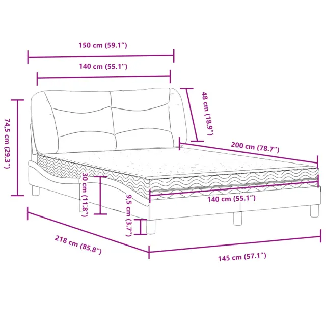 S to posteljo z vzmetnico si zagotovite bolj miren spanec! Je prijeten dodatek za vsako spalnico. Trpežno blago: Blago zagotavlja preprost in čist videz, poleg tega pa je zračno in trpežno.Letvice iz vezanega lesa: Letvice iz vezanega lesa omogočajo dobro porazdelitev teže in zagotavljajo, da vzmetnica ostane na mestu ob vsakem zasuku in obračanju med spanjem.Udobna opora: To vzglavje za posteljo vam zagotavlja odlično oporo za hrbet, ko sedite na postelji in berete ali gledate filme.Vzmetnica iz pene: Za optimalno udobje je ta triplastna vzmetnica iz tkanine napolnjena z 22D PU peno. Pomaga lajšati utrujenost in spodbuja krvni obtok ter zagotavlja popolno sprostitev in kakovosten spanec. Poleg tega je vzmetnica na voljo v trdotah H2 in H3, tako da jo lahko preprosto obrnete in izberete trdoto, ki vam najbolj ustreza.Valovita stranica: Valoviti videz posteljnega okvirja je eleganten in prefinjen. Dekorju v vašem domu dodaja sodoben in eleganten pridih ter tako postane osrednja točka spalnice.Posteljni okvir:Barva: ČrnaMaterial: Tkanina (100 % poliester), kovina, trdna borovina, vezan lesCelotne dimenzije: 218 x 145 x 74,5 cm (D x Š x V)Oblazinjeno vzglavje:Barva: ČrnaMaterial: Blago (100 % poliester)Material polnila: PP vlaknaDimenzije: 150 x 15 x 48 cm (D x Š x V)Vzmetnica iz pene:Barva: Bela Material prevleke: Pletenina Material polnila: 22D PU pena Trdota: H2 in H3 Celotne dimenzije: 140 x 200 x 17 cm (Š x D x D)Potrebno sestavljanje: DaPaket vsebuje:1 x Posteljni okvir1 x Oblazinjeno vzglavje1 x Vzmetnica iz pene 3208536