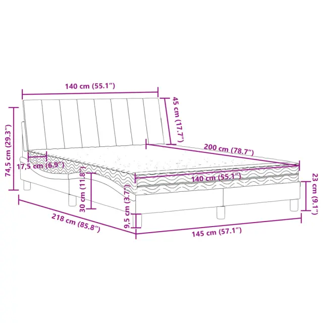 S to posteljo z vzmetnico si zagotovite bolj miren spanec! Je prijeten dodatek za vsako spalnico. Mehak žamet: Žamet je mehka in udobna tkanina, ki je prijetna do kože.Letvice iz vezanega lesa: Letvice iz vezanega lesa omogočajo dobro porazdelitev teže in zagotavljajo, da vzmetnica ostane na mestu ob vsakem zasuku in obračanju med spanjem.Udobna opora: To vzglavje za posteljo vam zagotavlja odlično oporo za hrbet, ko sedite na postelji in berete ali gledate filme.Vzmetnica iz pene: Za optimalno udobje je ta triplastna vzmetnica iz tkanine napolnjena z 22D PU peno. Pomaga lajšati utrujenost in spodbuja krvni obtok ter zagotavlja popolno sprostitev in kakovosten spanec. Poleg tega je vzmetnica na voljo v trdotah H2 in H3, tako da jo lahko preprosto obrnete in izberete trdoto, ki vam najbolj ustreza.Valovita stranica: Valoviti videz posteljnega okvirja je eleganten in prefinjen. Dekorju v vašem domu dodaja sodoben in eleganten pridih ter tako postane osrednja točka spalnice.Posteljni okvir:Barva: ModraMaterial: Žamet (100 % poliester), kovina, trdna borovina, vezan lesCelotne dimenzije: 218 x 145 x 74,5 cm (D x Š x V)Oblazinjeno vzglavje:Barva: ModraMaterial: Žamet (100 % poliester)Material polnila: PenaDimenzije: 140 x 3 x 45 cm (D x Š x V)Vzmetnica iz pene:Barva: Bela Material prevleke: Pletenina Material polnila: 22D PU pena Trdota: H2 in H3 Celotne dimenzije: 140 x 200 x 17 cm (Š x D x D)Potrebno sestavljanje: DaPaket vsebuje:1 x Posteljni okvir1 x Oblazinjeno vzglavje1 x Vzmetnica iz pene 3208602