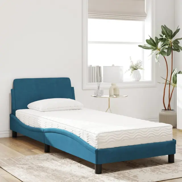 S to posteljo z vzmetnico si zagotovite bolj miren spanec! Je prijeten dodatek za vsako spalnico. Mehak žamet: Žamet je mehka in udobna tkanina, ki je prijetna do kože.Letvice iz vezanega lesa: Letvice iz vezanega lesa omogočajo dobro porazdelitev teže in zagotavljajo, da vzmetnica ostane na mestu ob vsakem zasuku in obračanju med spanjem.Udobna opora: To vzglavje za posteljo vam zagotavlja odlično oporo za hrbet, ko sedite na postelji in berete ali gledate filme.Vzmetnica iz pene: Za optimalno udobje je ta triplastna vzmetnica iz tkanine napolnjena z 22D PU peno. Pomaga lajšati utrujenost in spodbuja krvni obtok ter zagotavlja popolno sprostitev in kakovosten spanec. Poleg tega je vzmetnica na voljo v trdotah H2 in H3, tako da jo lahko preprosto obrnete in izberete trdoto, ki vam najbolj ustreza.Valovita stranica: Valoviti videz posteljnega okvirja je eleganten in prefinjen. Dekorju v vašem domu dodaja sodoben in eleganten pridih ter tako postane osrednja točka spalnice.Posteljni okvir:Barva: ModraMaterial: Žamet (100 % poliester), kovina, trdna borovina, vezan les, inženirski lesCelotne dimenzije: 208 x 95 x 74,5 cm (D x Š x V)Vzmetnica iz pene:Barva: Bela Material prevleke: Pletenina Material polnila: 22D PU pena Trdota: H2 in H3 Celotne dimenzije: 90 x 190 x 17 cm (Š x D x D)Potrebno sestavljanje: DaPaket vsebuje:1 x Posteljni okvir1 x Vzmetnica iz pene 3208315