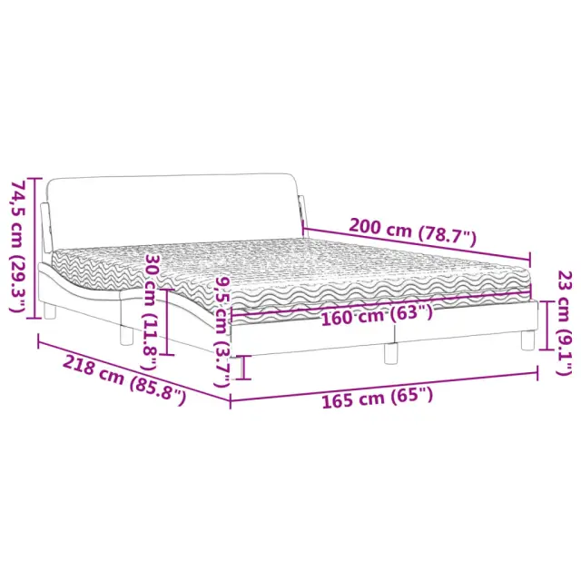 S to posteljo z vzmetnico si zagotovite bolj miren spanec! Je prijeten dodatek za vsako spalnico. Mehak žamet: Žamet je mehka in udobna tkanina, ki je prijetna do kože.Letvice iz vezanega lesa: Letvice iz vezanega lesa omogočajo dobro porazdelitev teže in zagotavljajo, da vzmetnica ostane na mestu ob vsakem zasuku in obračanju med spanjem.Udobna opora: To vzglavje za posteljo vam zagotavlja odlično oporo za hrbet, ko sedite na postelji in berete ali gledate filme.Vzmetnica iz pene: Za optimalno udobje je ta triplastna vzmetnica iz tkanine napolnjena z 22D PU peno. Pomaga lajšati utrujenost in spodbuja krvni obtok ter zagotavlja popolno sprostitev in kakovosten spanec. Poleg tega je vzmetnica na voljo v trdotah H2 in H3, tako da jo lahko preprosto obrnete in izberete trdoto, ki vam najbolj ustreza.Valovita stranica: Valoviti videz posteljnega okvirja je eleganten in prefinjen. Dekorju v vašem domu dodaja sodoben in eleganten pridih ter tako postane osrednja točka spalnice.Posteljni okvir:Barva: ModraMaterial: Žamet (100 % poliester), kovina, trdna borovina, vezan lesCelotne dimenzije: 218 x 165 x 74,5 cm (D x Š x V)Vzmetnica iz pene:Barva: Bela Material prevleke: Pletenina Material polnila: 22D PU pena Trdota: H2 in H3 Celotne dimenzije: 160 x 200 x 17 cm (Š x D x D)Potrebno sestavljanje: DaPaket vsebuje:1 x Posteljni okvir1 x Vzmetnica iz pene 3208435
