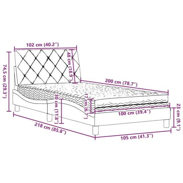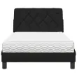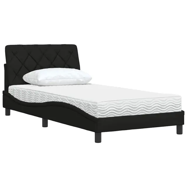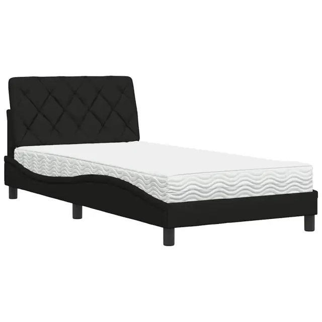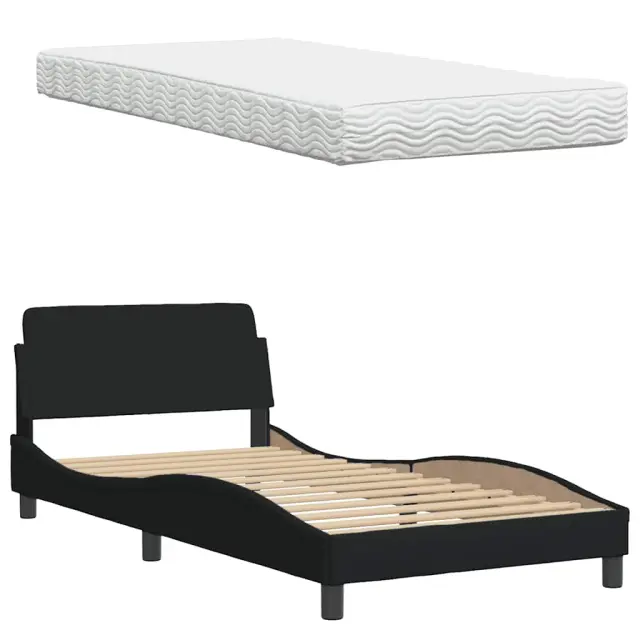 S to posteljo z vzmetnico si zagotovite bolj miren spanec! Je prijeten dodatek za vsako spalnico. Mehak in trpežen material: Tkanina iz poliestra ponuja kombinacijo mehkobe, zračnosti in trpežnosti ter vam zagotavlja popolno udobje in prijetnost.Vzmetnica iz pene: Ta vzmetnica ima plasti pene, ki se prilagajajo telesu in zmanjšujejo pritisk na občutljive predele, kot so vrat, ramena, hrbet in boki. Poleg tega absorbira udarce in zmanjšuje hrup zaradi gibanja ponoči.Vzmetna škatla ni potrebna: Okvir postelje ima letveno podlago, ki zagotavlja odlično oporo in zračnost za ležišče, zato ni potrebna vzmetnica.Odlična podpora: Vzglavna stranica je napolnjena s PP vlakni za izjemno mehkobo in optimalno udobje ter zagotavlja odlično podporo hrbtu, ko sedite v postelji in berete ali gledate televizijo.Stabilne in vzdržljive noge: Ta postelja ima trdne noge, ki zagotavljajo stabilnost, varnost in trdnost. Dobro je vedeti:Zaradi higienskih razlogov vzmetnice ni mogoče vrniti po odstranitvi ali odprtju embalaže.Posteljni okvir:Barva: ČrnaMaterial: Tkanina (100 % poliester), kovina, vezan les, inženirski lesCelotne dimenzije: 218 x 105 x 74,5 cm (D x Š x V)Potrebno sestavljanje: DaVzmetnica:Barva: BelaMaterial prevleke: PleteninaMaterial polnila: 22D PU penaTrdota: H2 in H3Dimenzije: 100 x 200 x 17 cm (Š x D x V)Oblazinjeno vzglavje:Barva: ČrnaMaterial: Blago (100 % poliester)Material polnila: PP vlaknaDimenzije: 102 x 6 x 48 cm (D x Š x V)Potrebno sestavljanje: DaPaket vsebuje:1 x Posteljni okvir1 x Vzmetnica1 x Oblazinjeno vzglavje 3310722