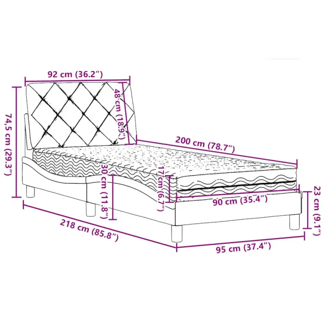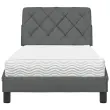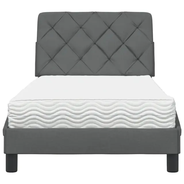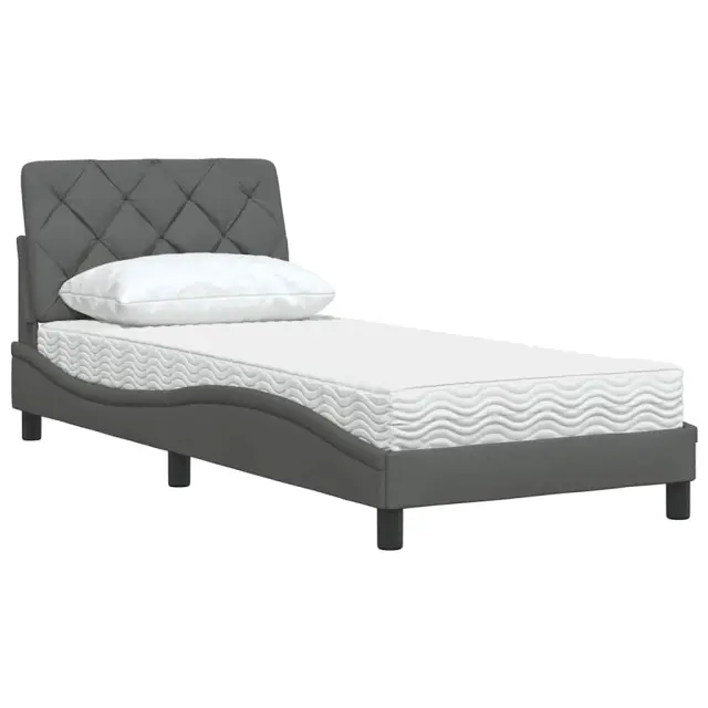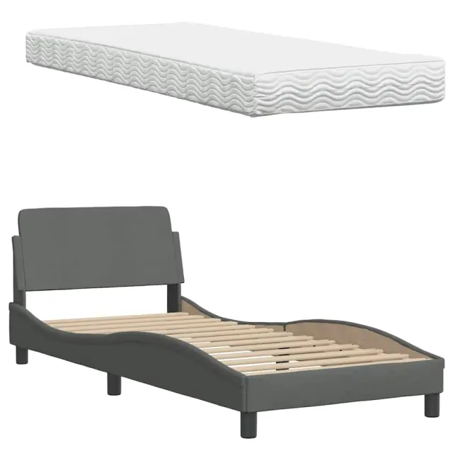 S to posteljo z vzmetnico si zagotovite bolj miren spanec! Je prijeten dodatek za vsako spalnico. Mehak in trpežen material: Tkanina iz poliestra ponuja kombinacijo mehkobe, zračnosti in trpežnosti ter vam zagotavlja popolno udobje in prijetnost.Vzmetnica iz pene: Ta vzmetnica ima plasti pene, ki se prilagajajo telesu in zmanjšujejo pritisk na občutljive predele, kot so vrat, ramena, hrbet in boki. Poleg tega absorbira udarce in zmanjšuje hrup zaradi gibanja ponoči.Vzmetna škatla ni potrebna: Okvir postelje ima letveno podlago, ki zagotavlja odlično oporo in zračnost za ležišče, zato ni potrebna vzmetnica.Odlična podpora: Vzglavna stranica je napolnjena s PP vlakni za izjemno mehkobo in optimalno udobje ter zagotavlja odlično podporo hrbtu, ko sedite v postelji in berete ali gledate televizijo.Stabilne in vzdržljive noge: Ta postelja ima trdne noge, ki zagotavljajo stabilnost, varnost in trdnost. Dobro je vedeti:Zaradi higienskih razlogov vzmetnice ni mogoče vrniti po odstranitvi ali odprtju embalaže.Posteljni okvir:Barva: Temno sivaMaterial: Tkanina (100 % poliester), kovina, vezan les, inženirski lesCelotne dimenzije: 218 x 95 x 74,5 cm (D x Š x V)Potrebno sestavljanje: DaVzmetnica:Barva: BelaMaterial prevleke: PleteninaMaterial polnila: 22D PU penaTrdota: H2 in H3Dimenzije: 90 x 200 x 17 cm (Š x D x V)Oblazinjeno vzglavje:Barva: Temno sivaMaterial: Blago (100 % poliester)Material polnila: PP vlaknaDimenzije: 92 x 6 x 48 cm (D x Š x V)Potrebno sestavljanje: DaPaket vsebuje:1 x Posteljni okvir1 x Vzmetnica1 x Oblazinjeno vzglavje 3310714