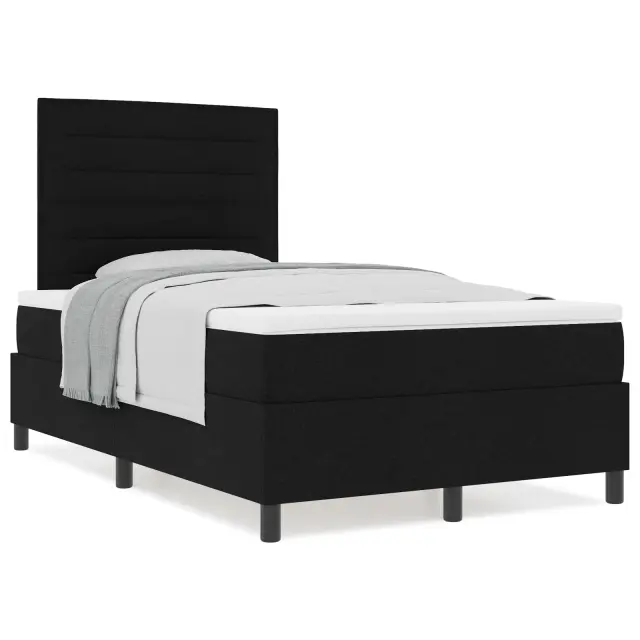 Ta postelja z vzmetnico združuje eleganco in praktičnost, kar jo naredi za najboljšo izbiro za spanje. S svojo črno tkanino in trdnimi borovimi nogami nudi slog in zanesljivost.