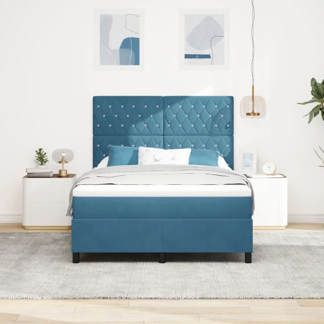 Ta vidaXL Postelja z vzmetnico s 140x200 cm vzmetnico se ponaša z izstopajočo temno modro žametno površino, ki daje stilski pridih tvoji spalnici. Njena kul zasnova in praktične funkcije jo naredijo super izbiro za vsakogar, ki želi osvežiti svoj spanec, bodisi zase ali ko gostiš.