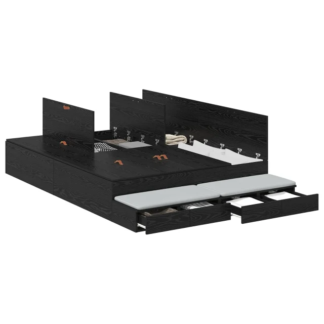 Ta postelja za shranjevanje iz črnega hrasta ponuja elegantno in praktično rešitev za moderne spalnice. Njena čista zasnova je odlična za odrasle, ki želijo imeti vse urejeno in estetsko, saj ponuja veliko prostora za shranjevanje, medtem ko lepo izgleda v tvoji sobi.