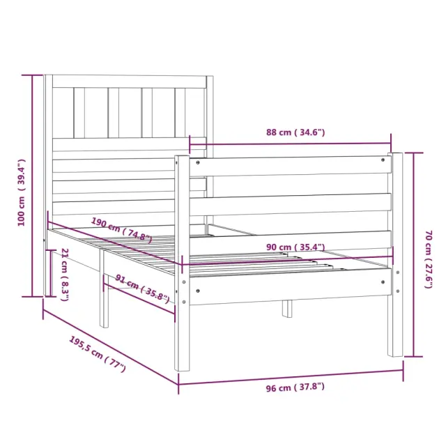 Ta posteljni okvir preproste in brezčasne oblike bo resnično praktičen in dekorativen dodatek za vašo spalnico. Vrhunska trdna borovina: Trdna borovina je čudovit naravni material. Površino obdelajte z oljem, voskom, lakom ali glazurnim premazom za močnejšo površino in enostavno čiščenje. Borovina ima ravne vzorce, grče pa dajejo materialu njegov značilen, rustikalen videz.Močan in stabilen okvir: Leseni okvirji zagotavljajo trdnost in stabilnost. Letveno dno iz trdne borovine vaši postelji zagotavlja dodatno podporo. Podaljša življenjsko dobo vaše vzmetnice, saj absorbira večino obremenitev in teže na postelji.Privlačen dizajn: Vzglavje in vznožje sta oblikovana tako dekorativno kot tudi praktično. Dodaja edinstven stil in udobje. Dobro je vedeti:Vzmetnica ni priložena. V naši trgovini si lahko ogledate ustrezne vzmetnice.Nekateri deli vzglavja so zaradi prostorskih omejitev zapakirani v škatlah v okvirju postelje.Ta posteljni okvir je primeren za vzmetnico velikosti 90 x 190 cm (3FT Single).Material: Trdna borovina (neobdelana)Celotne dimenzije posteljnega okvirja: 195,5 x 96 x 100 cm (D x Š x V)Spalna višina, merjena od tal: 21 cmVelikost primerne vzmetnice: 90 x 190 cm (Š x D) (vzmetnica ni priložena)Dimenzije vzglavja: 96 x 4 x 100 cm (Š x G x V)Potrebno sestavljanje: DaPaket vsebuje:1 x Posteljni okvir1 x Vzglavje 3101053