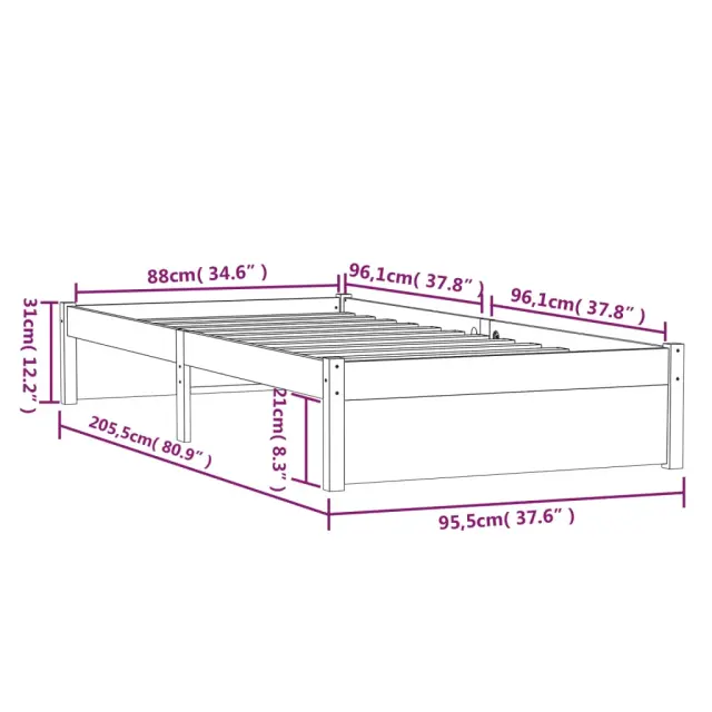 Ustvarite moderno spalnico s tem lesenim posteljnim okvirjem! To je praktičen in dekorativen dodatek za vaše notranje prostore. Vrhunska trdna borovina: Trdna borovina je čudovit naravni material. Borovina ima ravne vzorce, grče pa dajejo materialu njegov značilen, rustikalen videz.Stabilen posteljni okvir: Lesen okvir zagotavlja trdnost in stabilnost.Trdne letvice: Letvice iz vezanega lesa omogočajo dobro porazdelitev teže in zagotavljajo, da vzmetnica ostane na mestu ob vsakem zasuku in obračanju med spanjem.Primerna uporaba: Ta enojna postelja je odlična rešitev za majhne prostore, večnamenske sobe, enoposteljna ležišča in starejše otroke. Ne glede na vaše potrebe ali načrte ta enojna postelja ustreza različnim potrebam! Opomba:Paket vsebuje samo posteljni okvir. Vzmetnica ni priložena. V naši trgovini si lahko ogledate ustrezne vzmetnice.Ta posteljni okvir je primeren za vzmetnico velikosti 90 x 200 cm.Barva: BelaMaterial posteljnega okvirja: Trdna borovinaMaterial letvic: Vezan lesCelotne dimenzije: 205,5 x 95,5 x 31 cm (D x Š x V)Velikost primerne vzmetnice: 90 x 200 cm (Š x D) (vzmetnica ni priložena)Potrebno sestavljanje: Da 814935