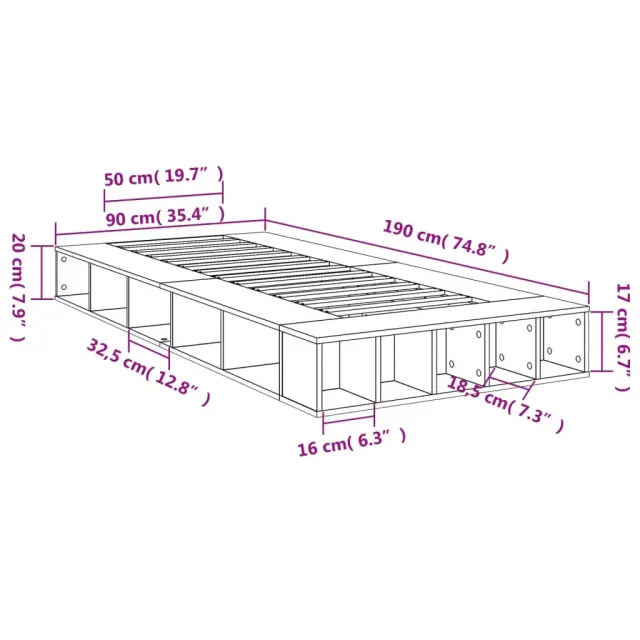 Zagotovite si boljši spanec s tem posteljnim okvirjem! Je prijeten dodatek za vsako spalnico. Vzdržljiv material: Posteljni okvir je izdelan iz inženirskega lesa. Inženirski les se ponaša z izjemno kakovostjo, gladko površino ter močjo, stabilnostjo in odpornostjo na vlago.Letvice za optimalno podporo: Okvir postelje je opremljen z letvicami, ki zagotavljajo osnovno podporo in zračnost vašega ležišča.Funkcija shranjevanja: Ta posteljni okvir ima odprte predelke za dobro organizacijo revij, knjig, igrač in drugih manjših predmetov. Dobro je vedeti:Vzmetnica ni priložena tej postelji. Ponujamo različno izbiro ležišč. V naši trgovini si lahko ogledate ustrezne vzmetnice.Barva: Betonsko sivaMaterial posteljnega okvirja: Inženirski lesMaterial letvic: Vezan lesCelotne dimenzije: 190 x 90 x 20 cm (D x Š x V)Dimenzije predelkov (vsak): 32,5/16 x 18,5 x 17 cm (D x Š x V)Velikost primerne vzmetnice: 90 x 190 cm (Š x D) (vzmetnica ni priložena)Potrebno sestavljanje: Da 3280527