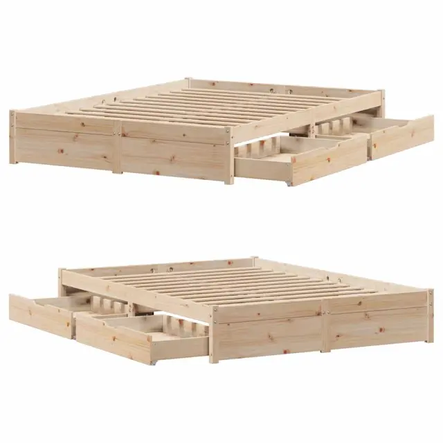 Zagotovite si boljši spanec s tem posteljnim okvirjem! Je prijeten dodatek za vsako spalnico. Stabilen in dolgotrajen okvir: Trdna borovina je znana po svoji trdnosti in trajnosti. Ravni vzorci in značilni vozli prispevajo k njenemu rustikalnemu čaru.Podnožje z letvami za optimalno podporo: Za podporo in zračnost ležišča je posteljni okvir opremljen z letvenim dnom.Popolnoma izkoriščen prostor: Ta posteljni okvir ima spodaj dva predala, ki omogočata shranjevanje predmetov, kot so dodatna posteljnina, sezonska oblačila in igrače.Preprosto manevriranje: Ta predal za shranjevanje pod posteljo ima štiri kolesa, ki zagotavljajo gladko in lahkotno manevriranje pri drsenju pod posteljo in izpod nje. Dobro je vedeti:Vzmetnica ni priložena tej postelji. Ponujamo različno izbiro ležišč. V naši trgovini si lahko ogledate ustrezne vzmetnice.Material: Trdna borovina (neobdelana)Potrebno sestavljanje: DaPostelja:Dimenzije: 205,5 x 165,5 x 31 cm (D x Š x V)Višina spalnega prostora, merjena od tal: 31 cmVišina prostora pod posteljo: 21 cmVelikost primerne vzmetnice: 160 x 200 cm (Š x D) (vzmetnica ni priložena)Največja nosilnost (z ležiščem): 100 kgZ letvenim podomPredal:Zunanje dimenzije: 95 x 55 x 17 cm (Š x G x V)Notranje dimenzije: 86,5 x 52,5 x 10 cm (Š x G x V)Maks. nosilnost (vsaka): 20 kgS štirimi kolesiPaket vsebuje:1 x Posteljni okvir z letvenim podnožjem2 x Predal 3301666
